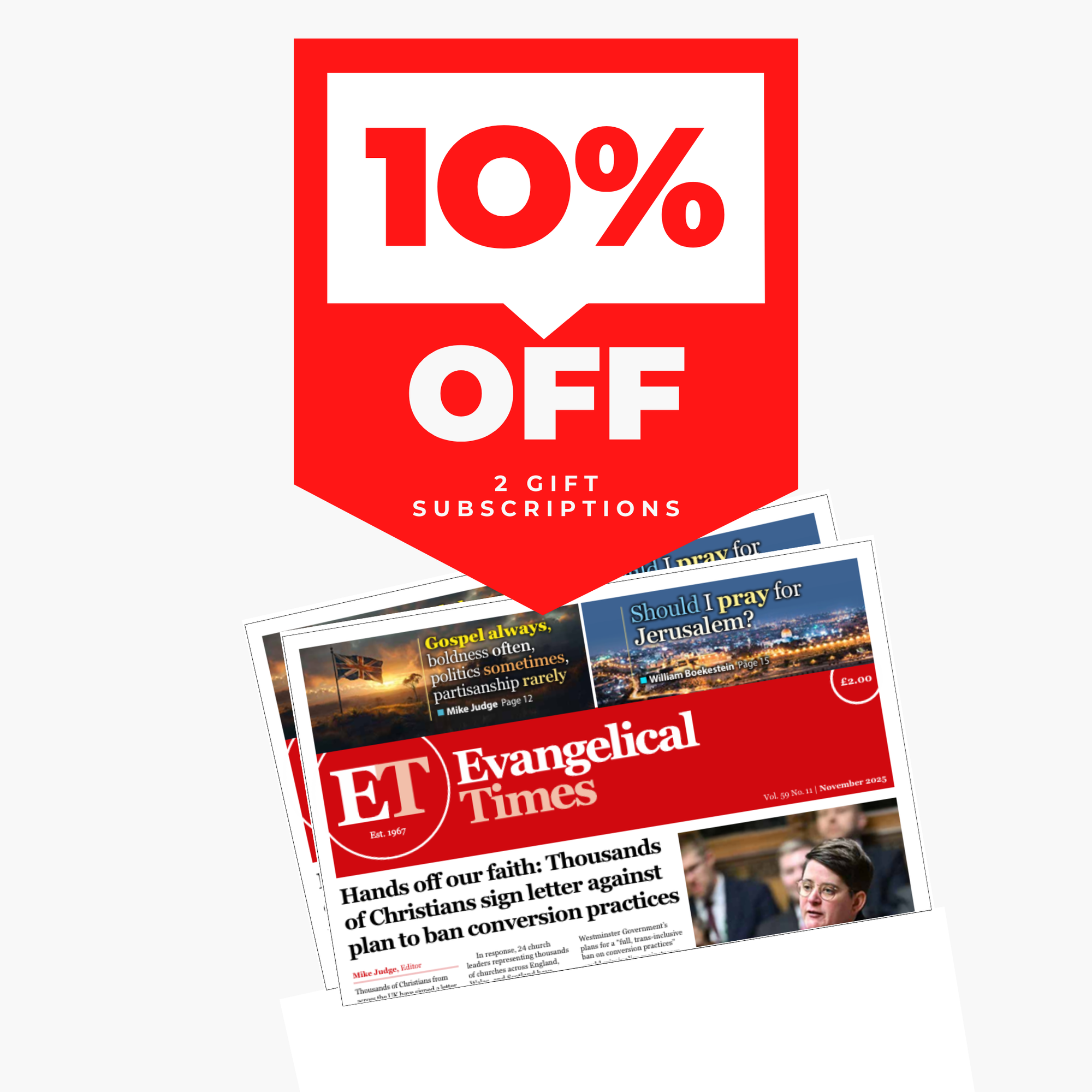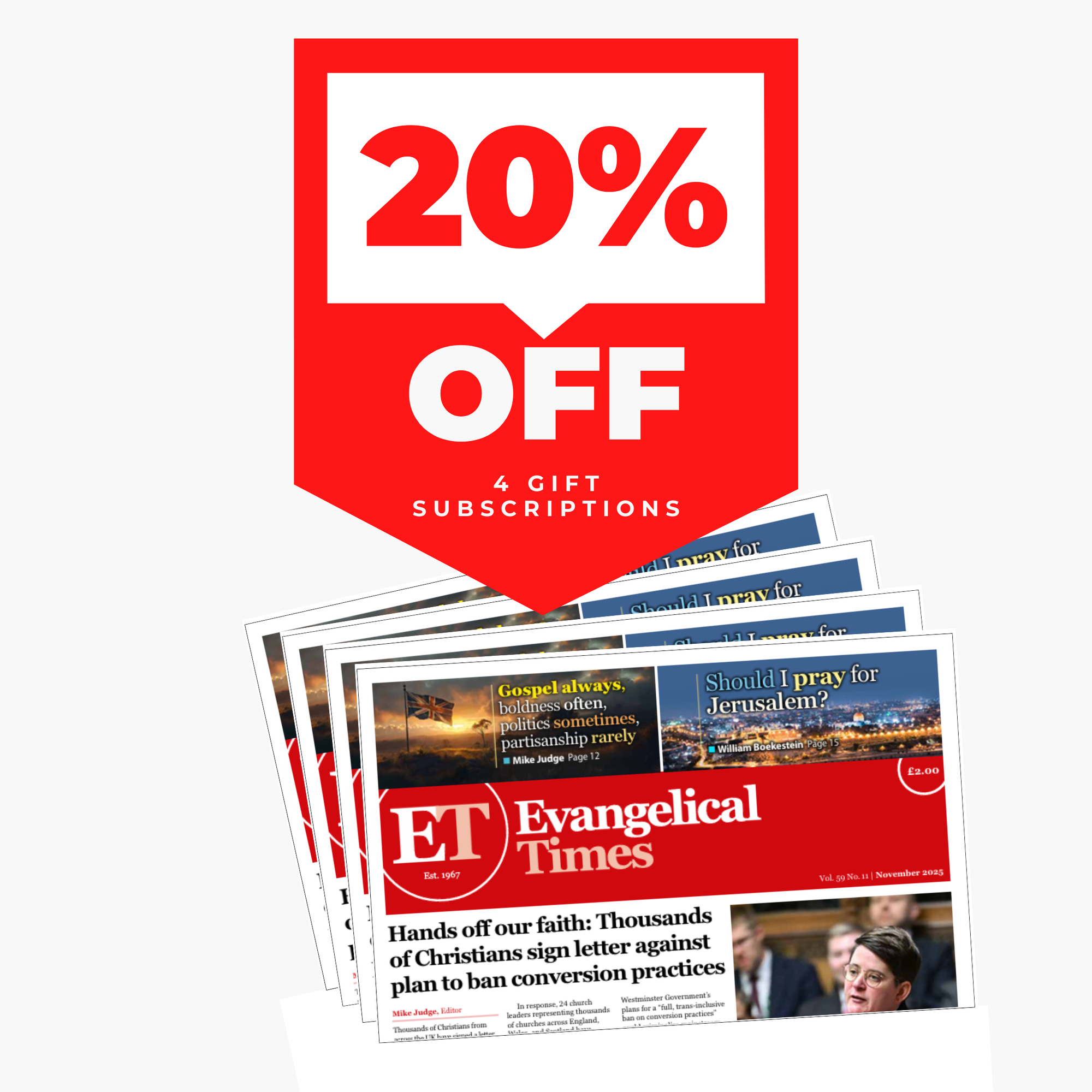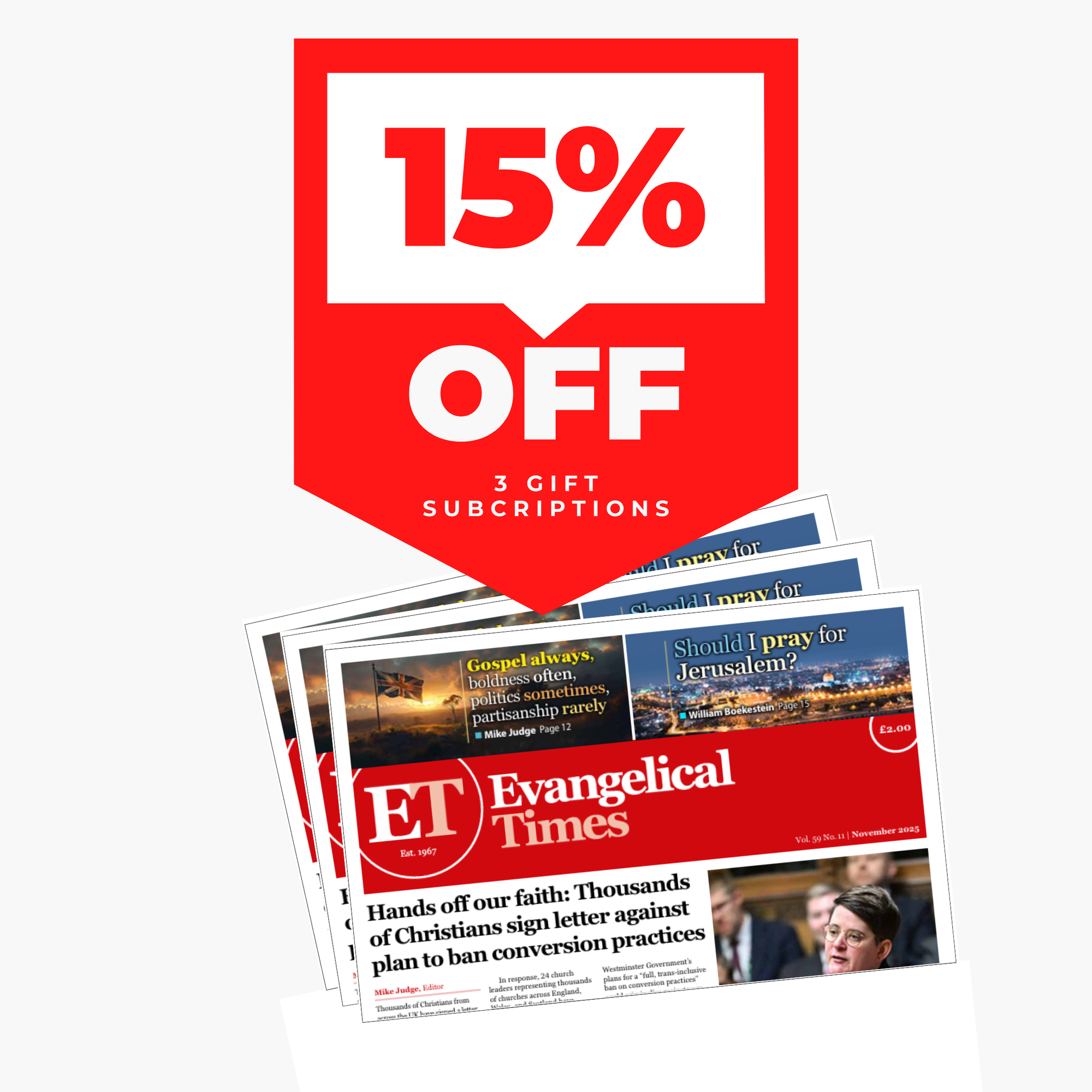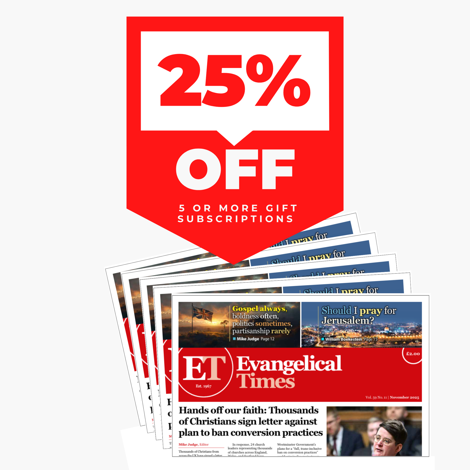 1 copy of Evangelical Times delivered to each of your UK recipients for 12 months.