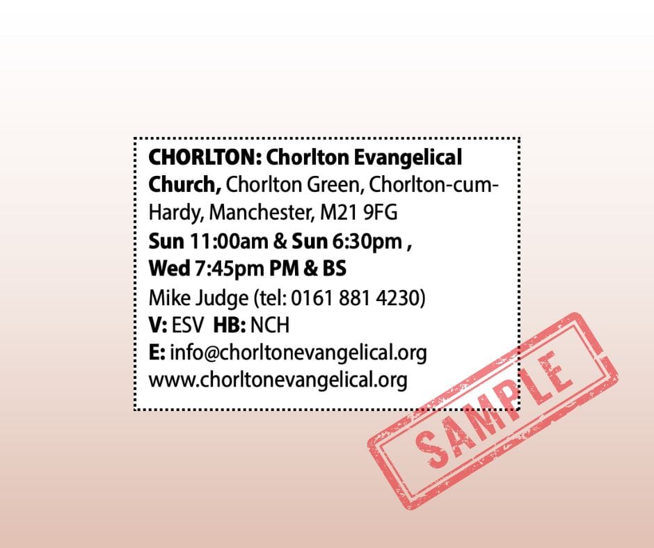Would you like to add your church to the ET church finder? This is a free service with 20,000+ searches every month. Click the button below to complete our request form. Or visit the ET Church Finder to review an existing listing. Need an edit? Request a 'magic link' to edit your church by emailing: communications@evangelical-times.org
